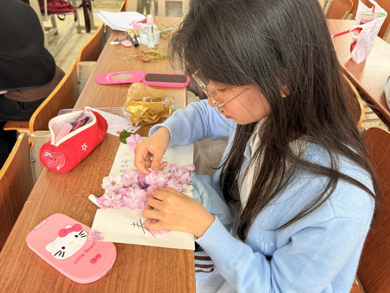 手作创作中,同学们细致整理归类各类植物素材,精心进行修剪、粘贴、装饰与标注,将普通花草枝叶,打造成精致的植物信笺、春日书签与自然手作摆件。专注的创作过程让同学们暂时放下纷扰,沉浸在动手的乐趣中,在专注与热爱里缓解焦虑、沉淀心境。每一件作品都独具匠心,或点缀简约字迹,或搭配淡雅底色,既留存了春光的鲜活,又承载着对春日的热爱与期许。